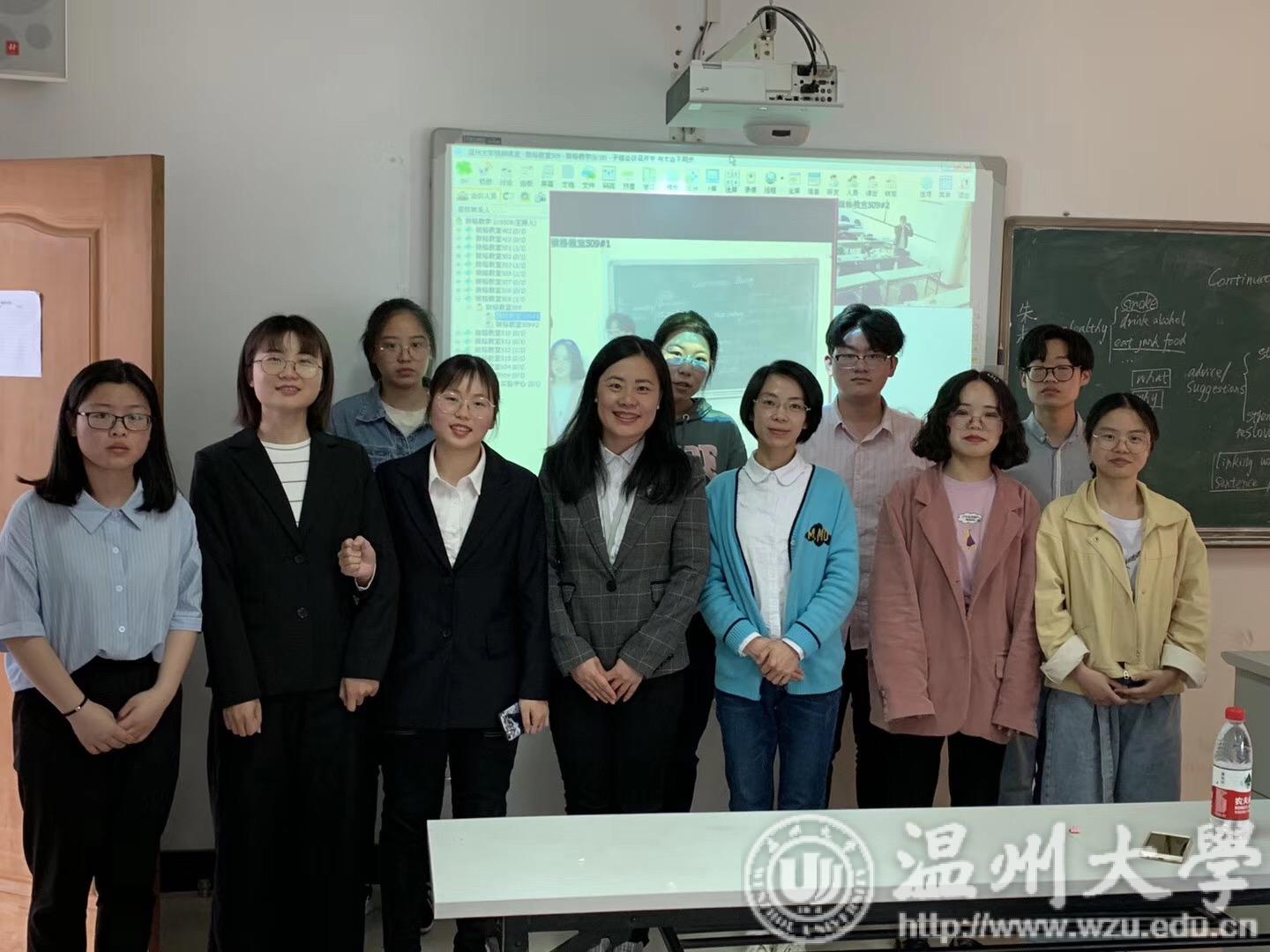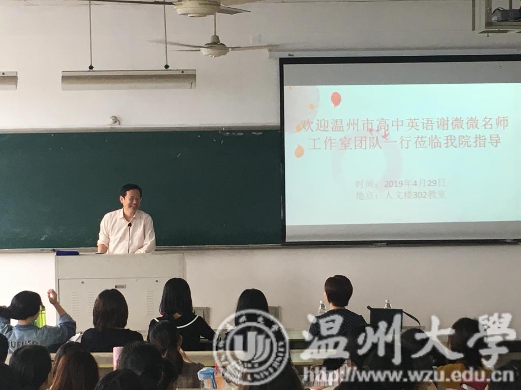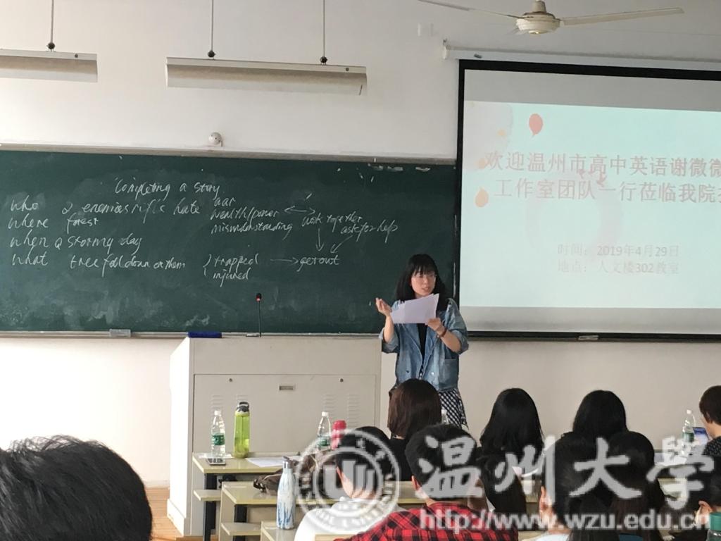 2019年4月29日到5月8日,以温州中学教授级高级教师谢微微为负责人,包括温州中学蔡丽丽老师、蔡夏冰老师、蔡珍瑞老师、丁丽芸老师、李晶老师、麻晨晨老师、钱盈老师、许少秋老师、叶彬彬老师、张倩老师、赵天红老师、朱婷婷老师,以及温州第十四高级中学谢津津老师等在内的谢微微名师工作室为必赢官网16级英语(师范)专业学生开设“教师资格证工作坊”特色实践课程。谢微微老师是必赢官网英语(师范)专业优秀校友,毛继光副院长代表外国语学院,既表达了对老师们表示了热烈欢迎,也提醒同学们要抓住这次难得的学习契机。该课程由李宋昊老师和薛丽芳老师负责。